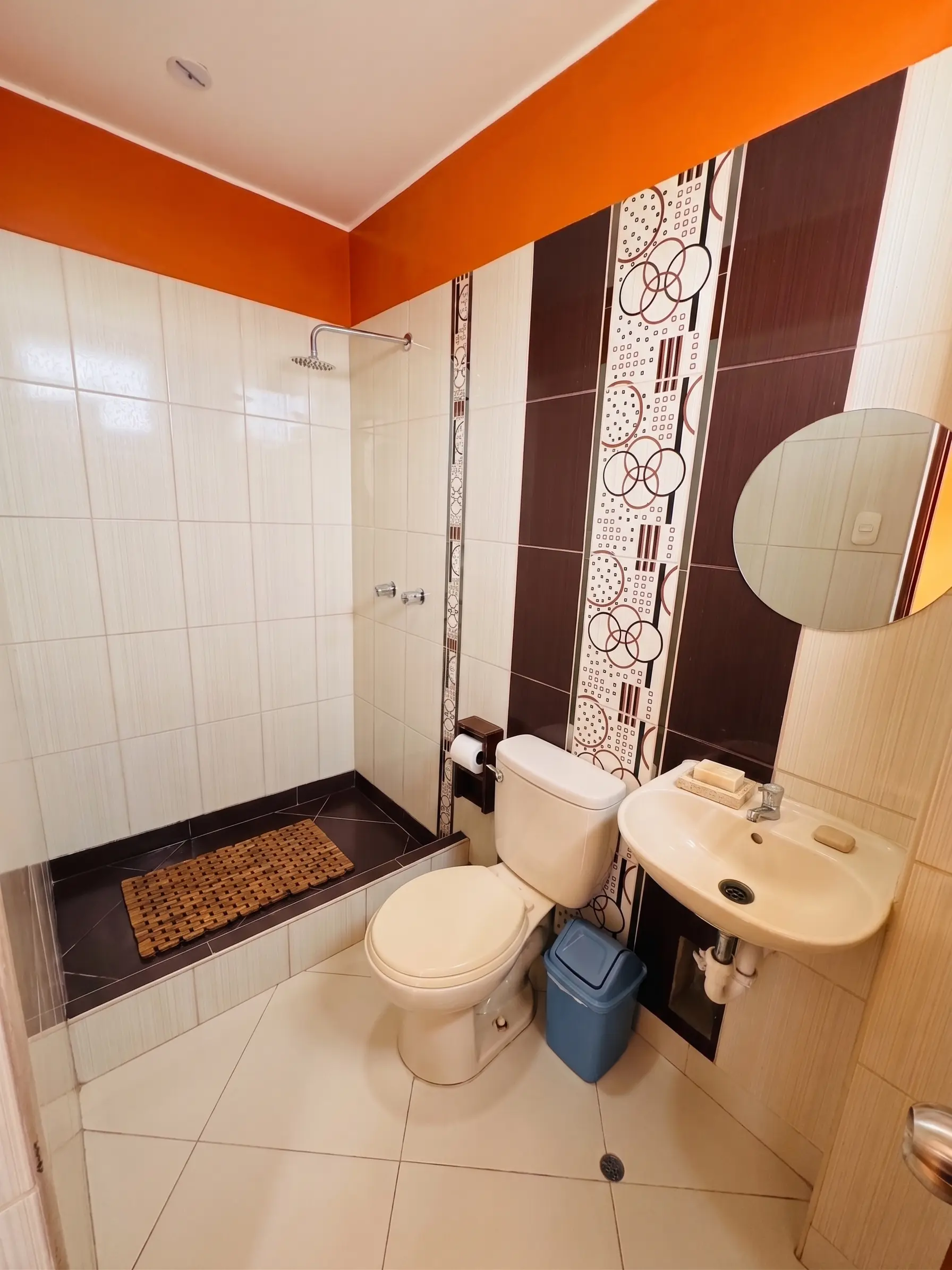 Incluye sillones rojos, televisor, ventilador y un espejo grande que hace que se sienta más amplia. Todo limpio, ordenado y listo para recibirlos.