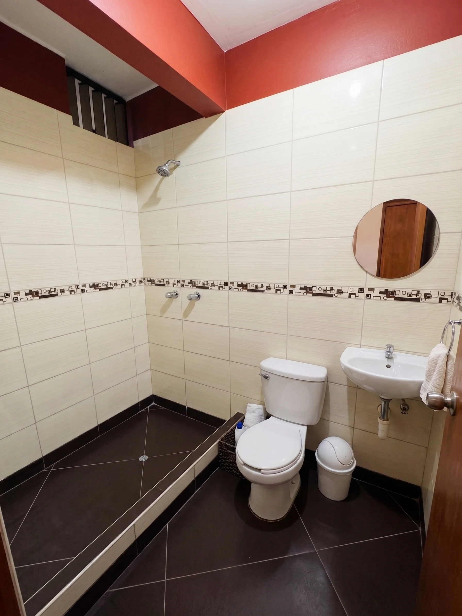 Incluye dos sillones rojos cómodos, televisor, ventilador, mesa de noche con lámpara y un espejo grande que hace que el espacio se sienta más amplio. Todo limpio, ordenado y listo para ustedes.