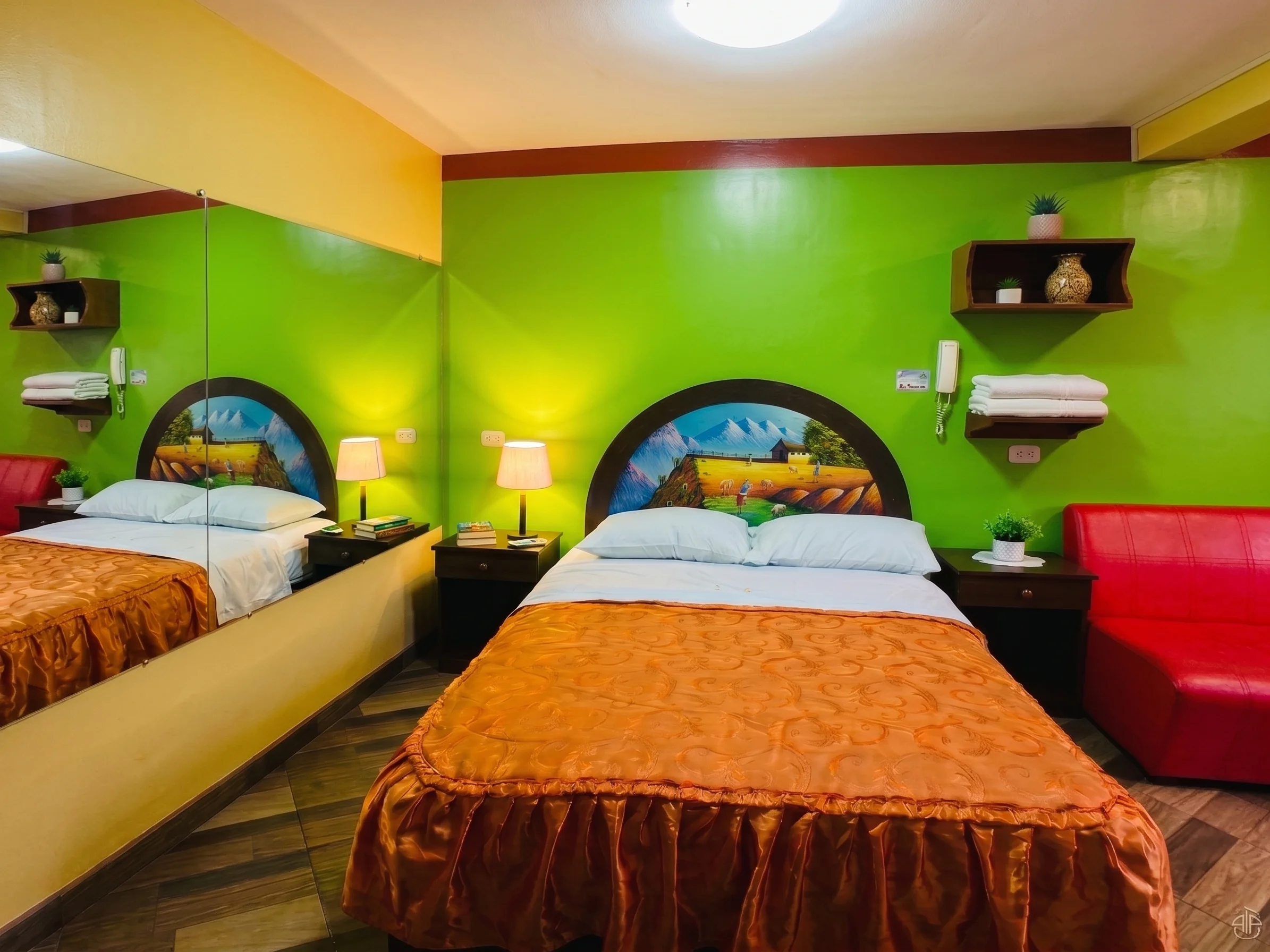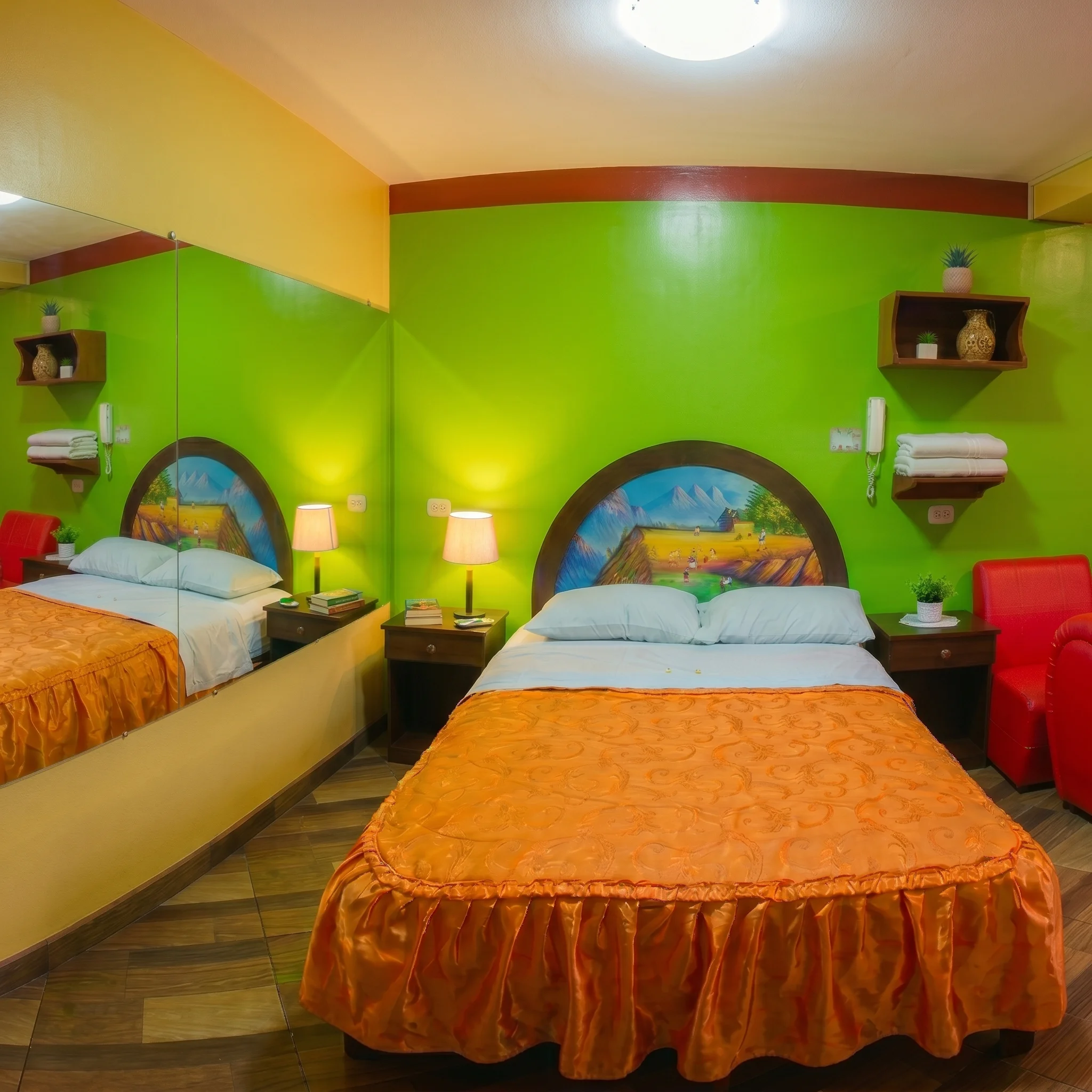 Esta habitación de parejas es perfecta para disfrutar una estadía romántica y cómoda. Tiene una cama matrimonial amplia con sábanas frescas y una colcha naranja que le da un toque cálido y acogedor. Las paredes en verde brillante, los detalles en rojo y el piso de porcelanato marrón crean un ambiente moderno, alegre y con muy buena onda, ideal para relajarse en pareja.