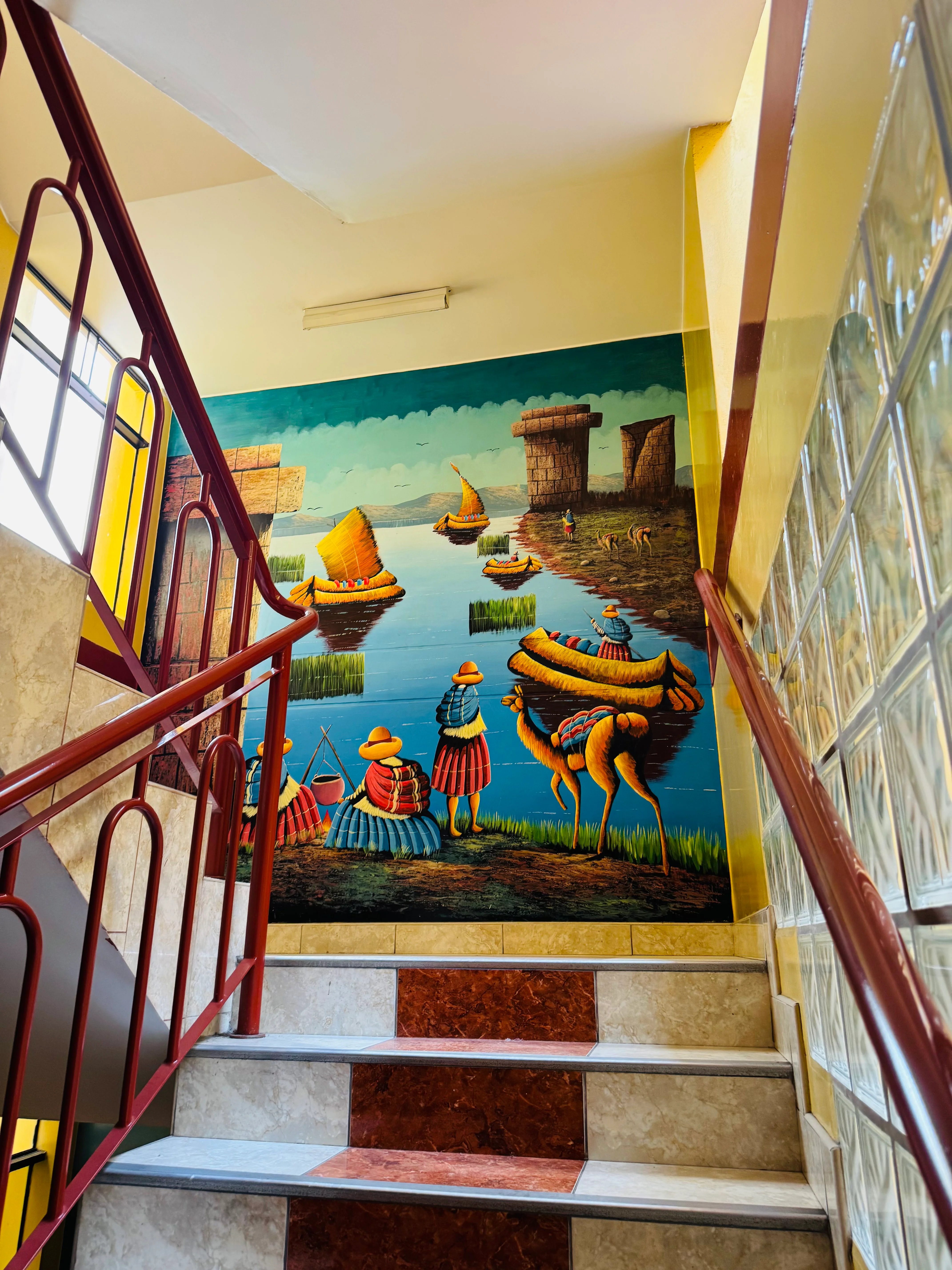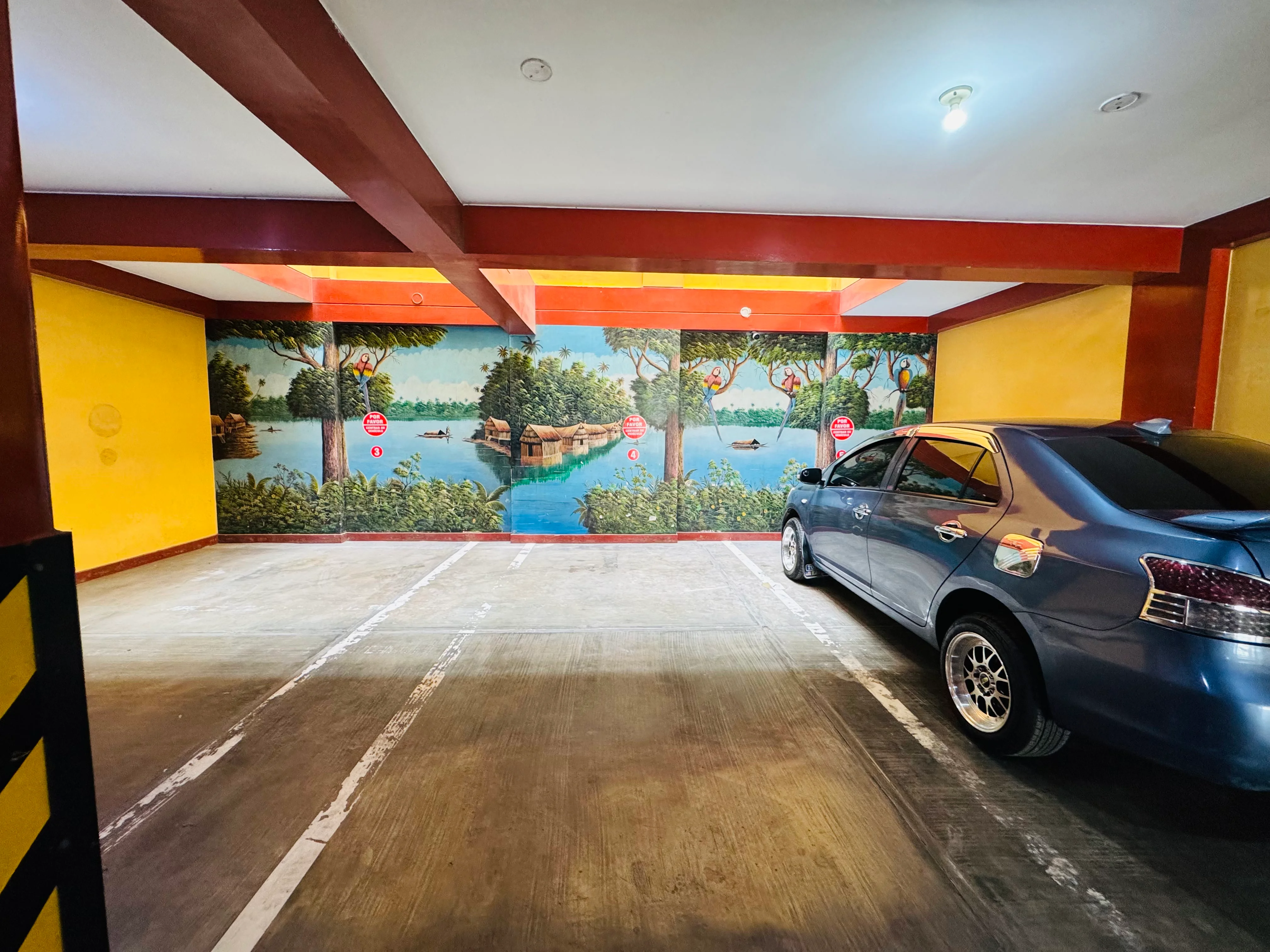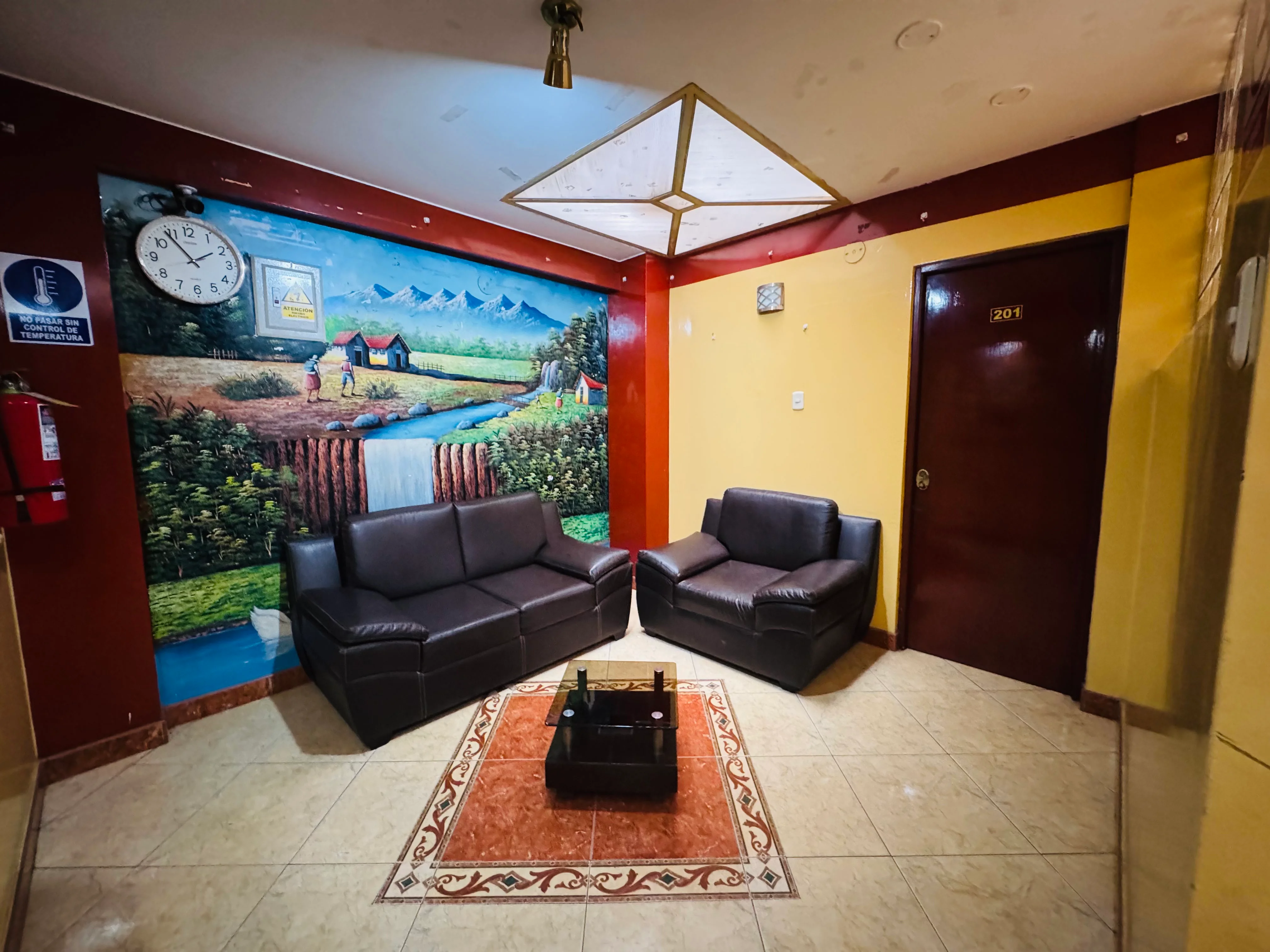 Incluye dos sillones rojos, televisor, ventilador, mesa de noche con lámpara y un espejo grande que hace que se sienta más amplia. Todo limpio y ordenado.