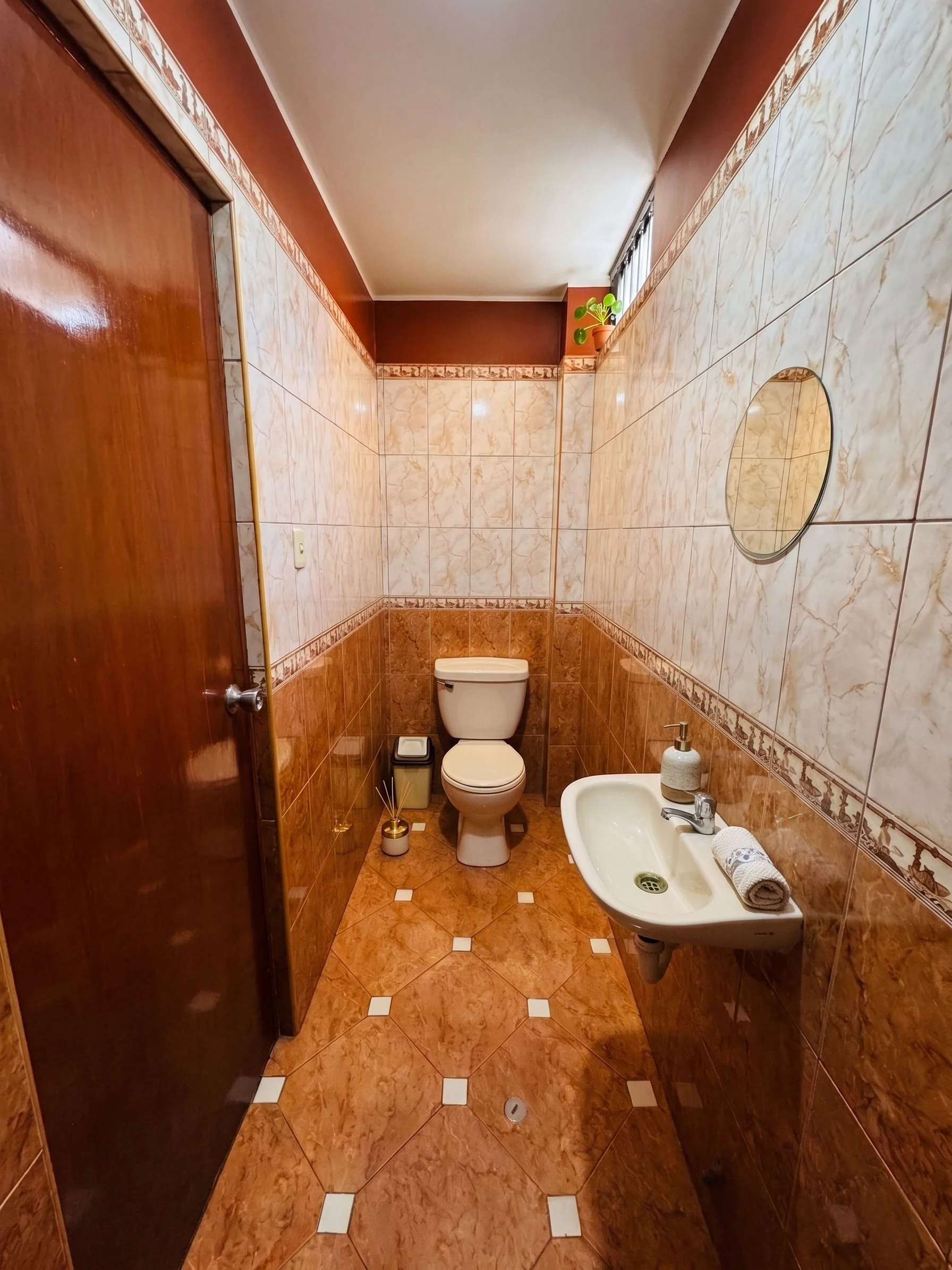 Esta habitación es perfecta para una o dos personas. Cuenta con una cama de plaza y media amplia y cómoda, sábanas frescas y una colcha naranja que le da calidez al espacio. Las paredes en verde brillante, los detalles en rojo y el piso de porcelanato marrón crean un ambiente moderno, alegre y con buena onda, ideal para descansar solo o acompañado.